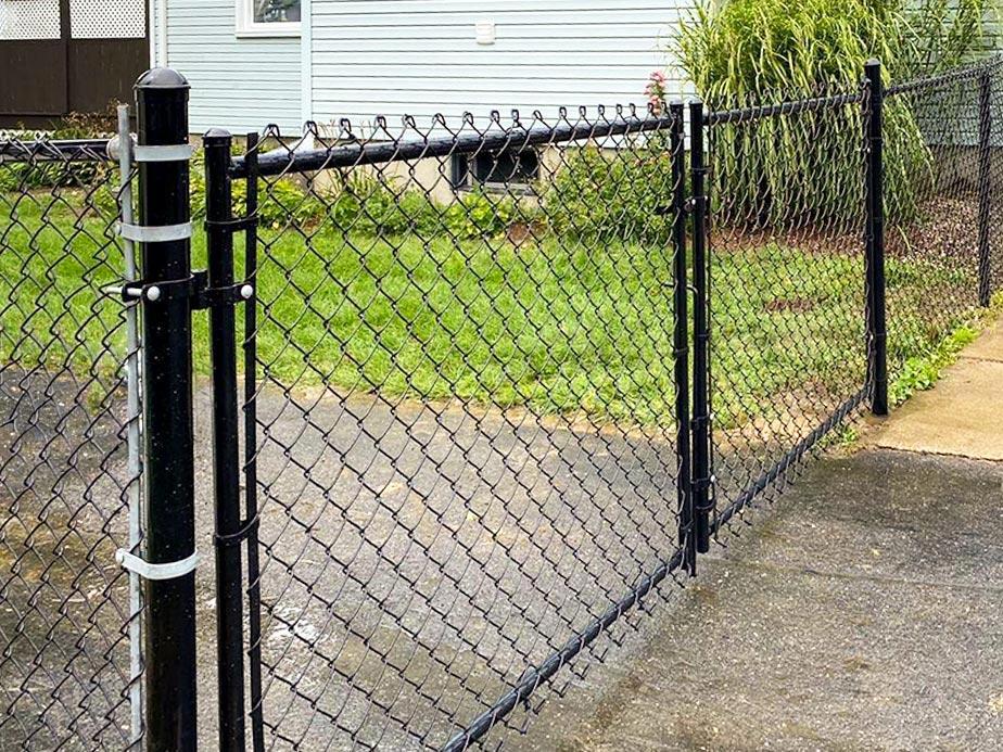 Chain link fencing is one of the most affordable fence materials. Property owners can upgrade to black PVC-coated chain link for a softer feel and extra durability. For full privacy fencing, choose the slatted style to prevent unwarranted visibility inside your space.